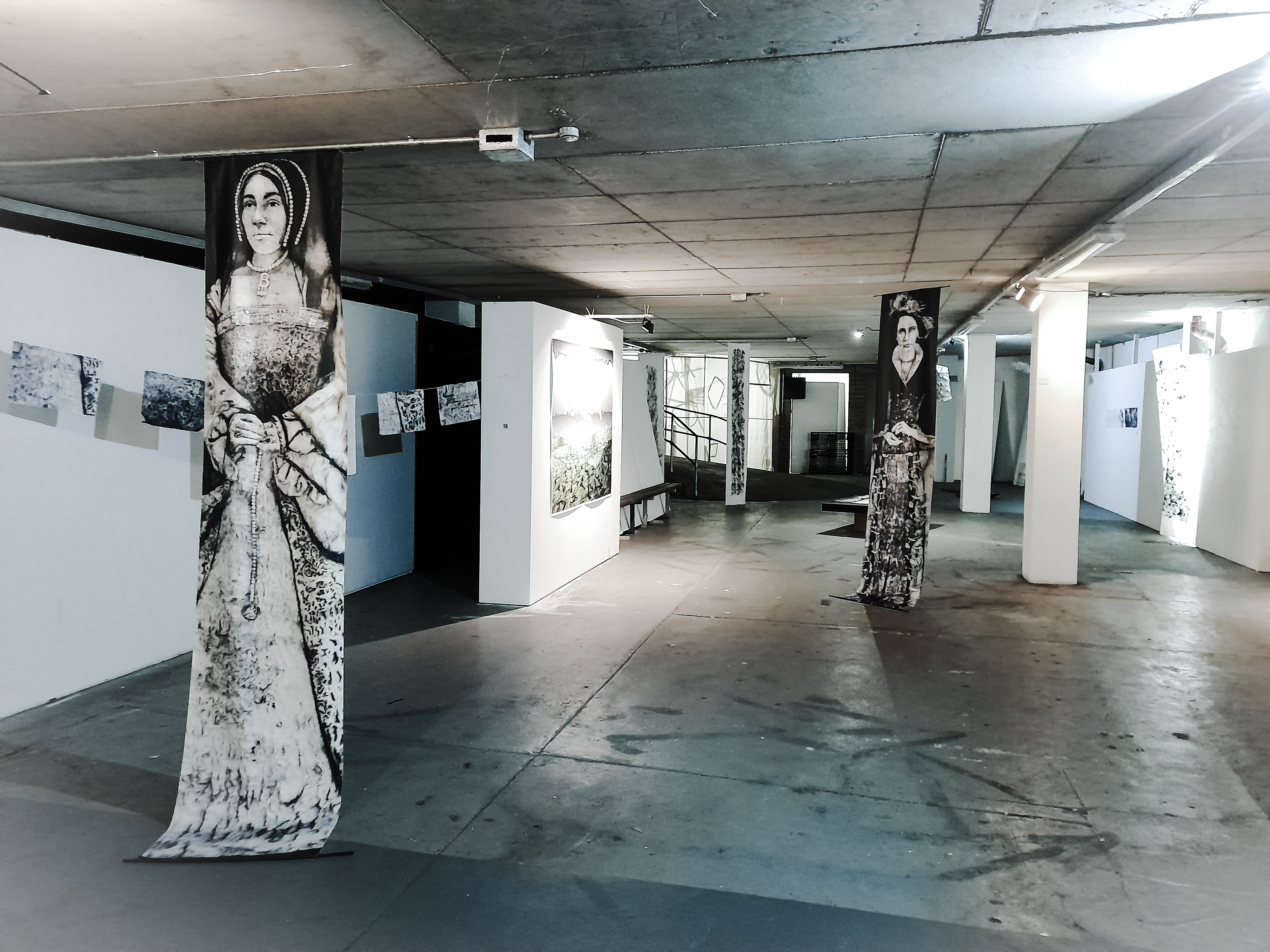 I wanted to share a little insight into the Queens’ installation at the gallery. I’ve documented their creation and their degrading on this blog and social media. The discolouration and ripping is all a part of their story. They are now entombed in a gallery that floods when it rains (which it did on the night before the opening day). I’m prepared that the damp is going to speed up their decay, but that’s rather compelling to me and I hope scan them again after the show to see a before and after.